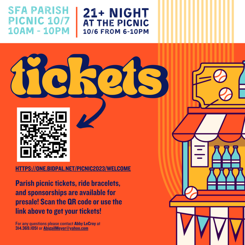 Advance ticket sales end Tuesday, October 3rd. Tickets will be available for in-person purchase on Friday and Saturday at the picnic. (Tickets are not sold through the rectory office. You will need to visit the ticket booth at the event to purchase.)